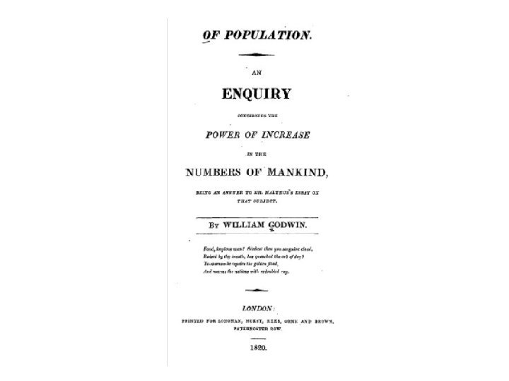 T. R. Malthus 1766 -1834 • Cambridge Graduate (i. e. , orthodox churchman) • Takes a living as a church of England clergyman • An Essay on the Principle of Population (1798) • Development of Political Economy