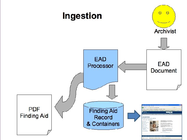 Technical • MS SQL Server database stores all of the data tables • Adobe Cold. Fusion programming (with some Java programming) • Structure based on function (i. e. EAD ingestion, PDF creation, image processing, deployment, etc) • EAD XML file is passed through parser, transforming the XML data into an EAD Document Object • Descriptive data from EAD is stored in various tables: Finding Aid table; Series table; Container table • Image converting, resizing, and watermarking is batch automated on a collection-wide level