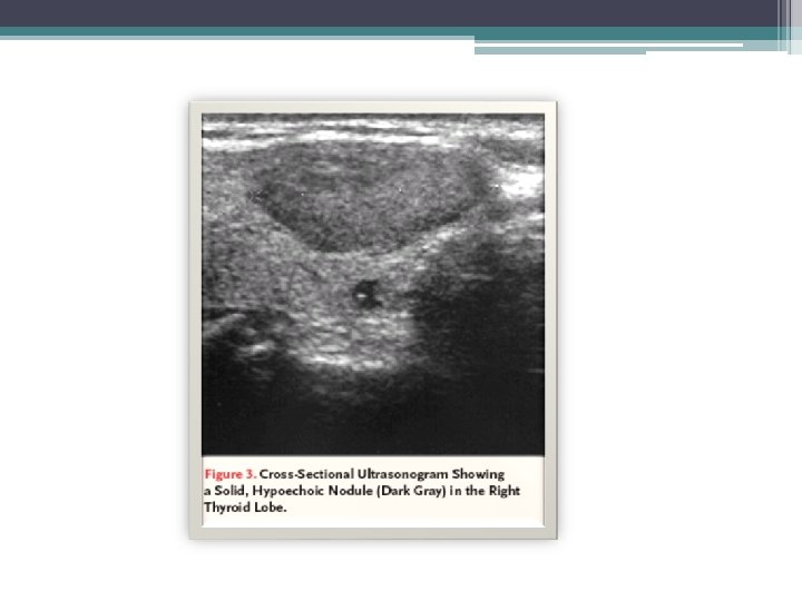 Ultrasound • Ultrasonographic Cancer Risk Factors for a Thyroid Nodule ▫ ▫ ▫ hypoechogenicity, microcalcifications, irregular margins, increased nodular flow visualized by Doppler, the evidence of invasion or regional lymphadenopathy