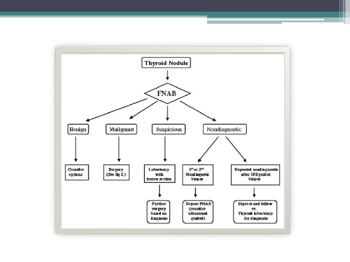 FNA results • Malignant- pt needs to have surgical management • Benign- observation with interval ultrasounds and clinical examinations • Indeterminate- radioisotope scan- perform suppression scan and if cold proceed to surgical management- if hot nodule consider observation • Non diagnostic- repeat FNA or U/S guided FNA