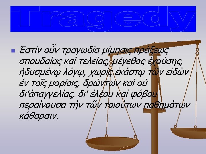 n n The philosopher Aristotle theorized in his work The Poetics that tragedy results in a catharsis (emotional cleansing) of healing for the audience through their experience of emotions such as pity, anger, disgust and terror in response to the suffering of the characters in the drama who progress through inner compulsionspsychological or religioustowards self-knowledge and death. He considers it superior when a character passes from good fortune to bad rather than the reverse.