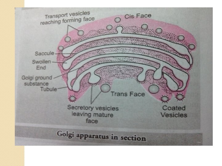 I. Cisternae: Ø The cisternae vary in number from 3 -7 in most animal cells and from 10 -20 in plant cells. Ø Usually equally spaced in the stack, separated from each other by thin layers of intercisternal cytoplasm. Ø Cisternae may be flat but are often curved. Ø Golgi complex has a distinct polarity, the two poles are called cis face and trans face, which act respectively as the receiving and shipping departments. Ø Convex side of stack forming (cis) face. Ø Concave side of stack maturing (trans) face. Ø Secretory materials reach the Golgi complex from Smooth Endoplasmic Reticulum (SER) by way of transport vesicles which bud off from SER and fuse with golgi cisternae on the cis face. Ø From the trans face Secretory vesicles arises that