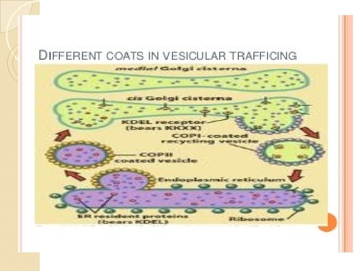 VESICULAR TRANSPORT �Vesicles leaving RER transported to the cis face of GA, fuse with the membrane and empty the contents into the lumen. �Molecules inside the lumen are modified and sorted for transport to the next destination. �Proteins destined for places other than ER and GA, moves to trans face. �Gets placed on either of the 3 vesicles, i. e. Exocytotic , Secretory and Lysosomal vesicles.
