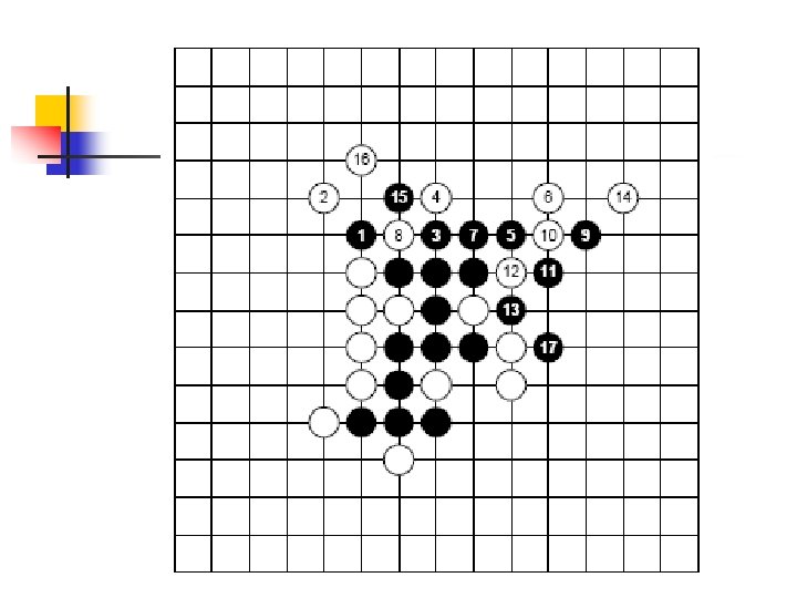Computer programs’ strategies n n The strongest Gomoku program use The difference program: Poly: 20~30 ply depath search until n-ply using heuristic Vertex: Search depath of 16 ply + extended openning book