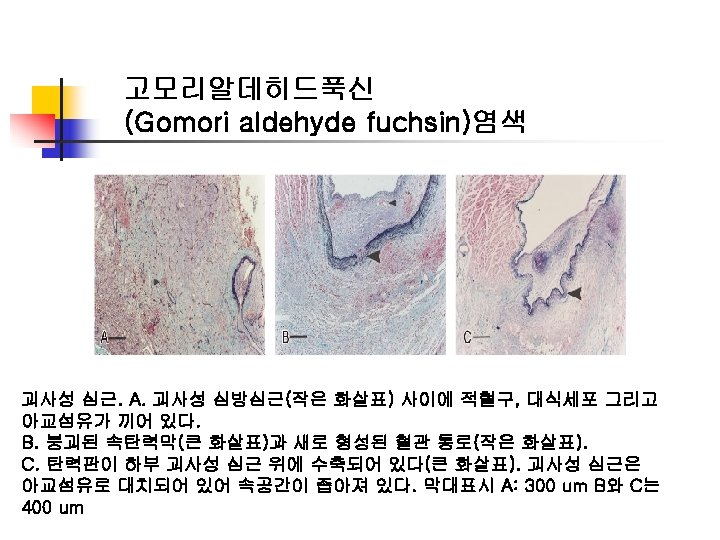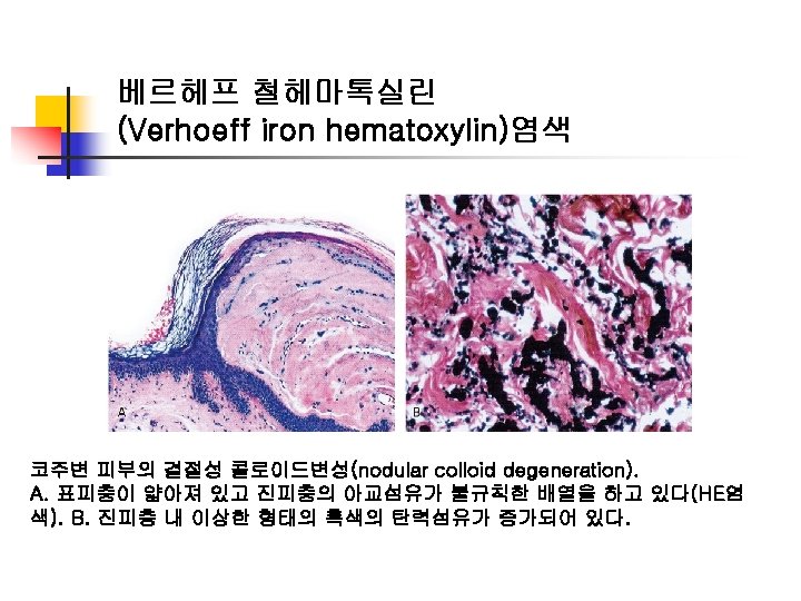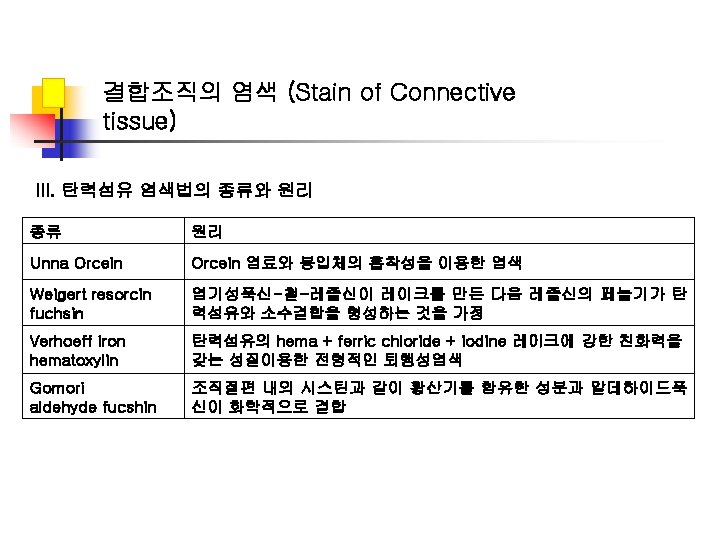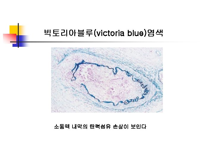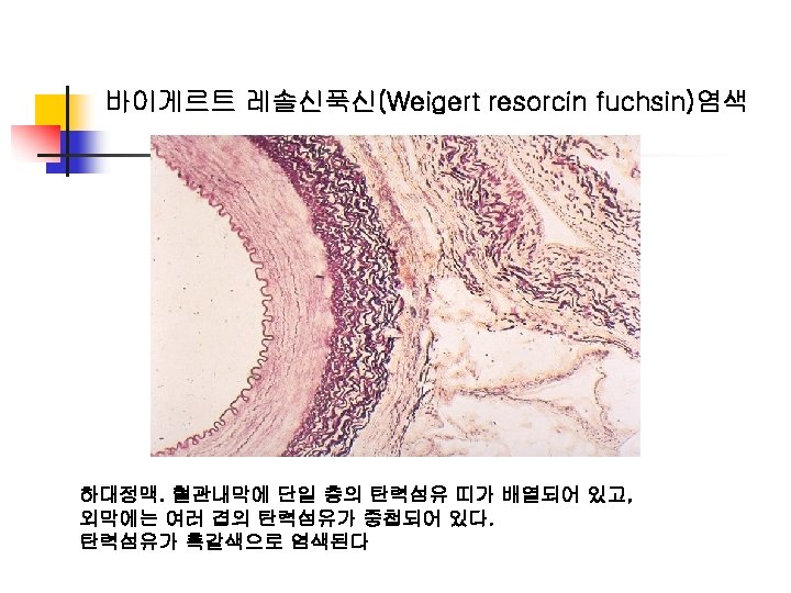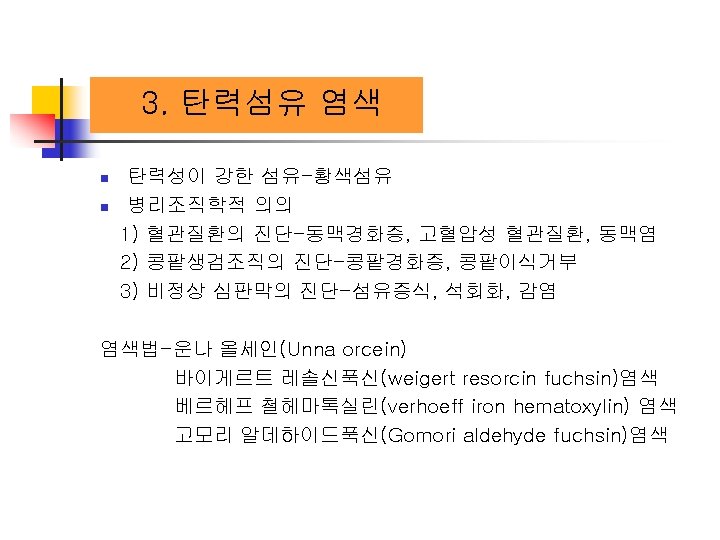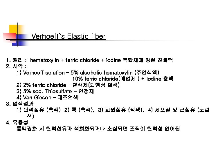 신선한 상태의 조직에서는 노란색을 띠며, 탄력형 동맥벽, 폐포벽, 각종 인대 등에 풍부하게 존재함. 주염색액 성 분 Gomori’s aldehyde-fuchsin Unna’s Orcein Verhoeff -van Gieson Weigert’s resorcin-fuchsin Hematoxylin Basic fuchsin Orcein Ferric chloride Resorcin HCl Iodine Ferric chloride Paraldehyde HCl 분 별 Ferric chloride 정 착 Sod. thiosulfate 대조염색 염색결과 Van Gieson 95% alcohol Van Gieson 70% alcohol Light green 탄력섬유-흑색 탄력섬유-흑청색 탄력섬유-적색 핵-----흑색 배경----녹색 교원섬유-적색 근섬유, 세포질-황색 탄력섬유-암갈색