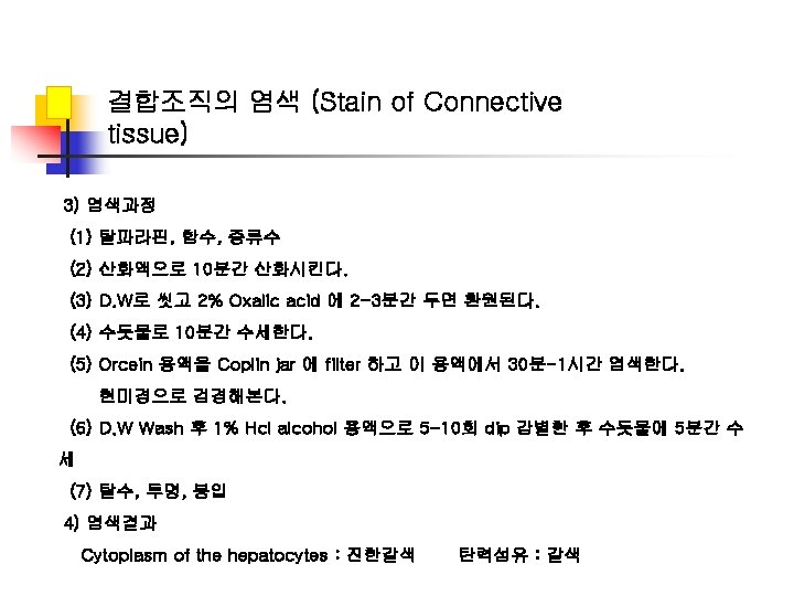 결합조직의 염색 (Stain of Connective tissue) 1. Australia antigen (Orcein)(HBs-Ag염색법) 1) 원리 : Orcein 염료는 봉입체와 흡착성 염색법에 의하여 염색된다. 2) 염색액제조 (1) 3% sulfuric acid : Sulfuric acid 3 ml + D. W 97 ml (2) 5% Pot. permanganate : Pot. permanganate 0. 5 g + D. W 10 ml (3) 산화제 : 5% Pot. permanganate 9. 5 ml + 3% sulfuric acid 5. 0 ml 두용액을 섞은 다음 100 ml 되게 D. W로 채운다. (4) 2% Oxalic acid : Oxalic acid 2 g + D. W 100 ml (5) Orcein solution 70% ethanol 100 ml + Orcein 1 g + Conc. HCl 1 ml p. H가 1 -2 사이라야 한다.