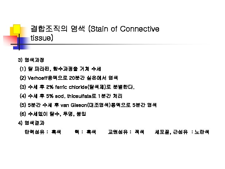 결합조직의 염색 (Stain of Connective tissue) 2. Verhoeff elastic fiber 1) 원리 : 탄력섬유의 hema + ferric chloride + iodine 복합체에 강한 친화력을 갖는 성질이용 2) 염색액제조 (1) Verhoeff sol : 5% alcoholic hema 2. 5 ml + 10% ferric chloride 1 ml + Verhoeff iodine 1 ml (2) 2% ferric chloride : 10% ferric chloride 9 ml + D. W 36 ml (3) 5% sod. thiosulfate (4) van Gieson (5) Verhoeff iodine : pot. Iodide 4 g + iodine 2 g + D. W 100 ml 증류수 4 ml에 pot. iodide를 먼저 용해 시키고 다음에 iodine을 첨가하여 완전히 용해 시킨다. 완전히 용해되면 나머지 증류수를 넣고 혼합하여 사용한다.
