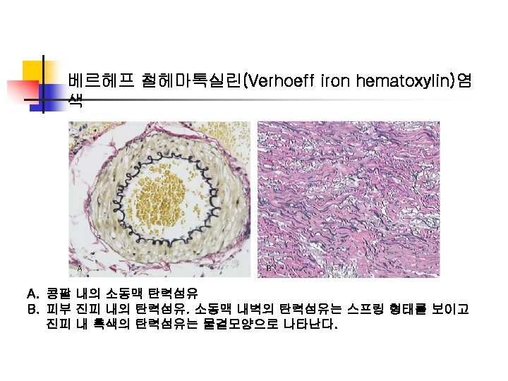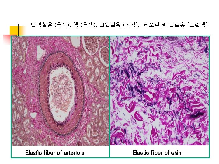 결합조직의 염색 (Stain of Connective tissue) Elastic fiber of arteriole Elastic fiber of skin