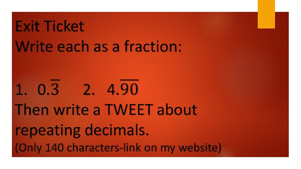 In 140 words or less describe what you have learned about repeating decimals. enter into this Padlet: https: //padlet. com/milesc 3/hr 9 g ohj 0 r 89 w Link is on my website.