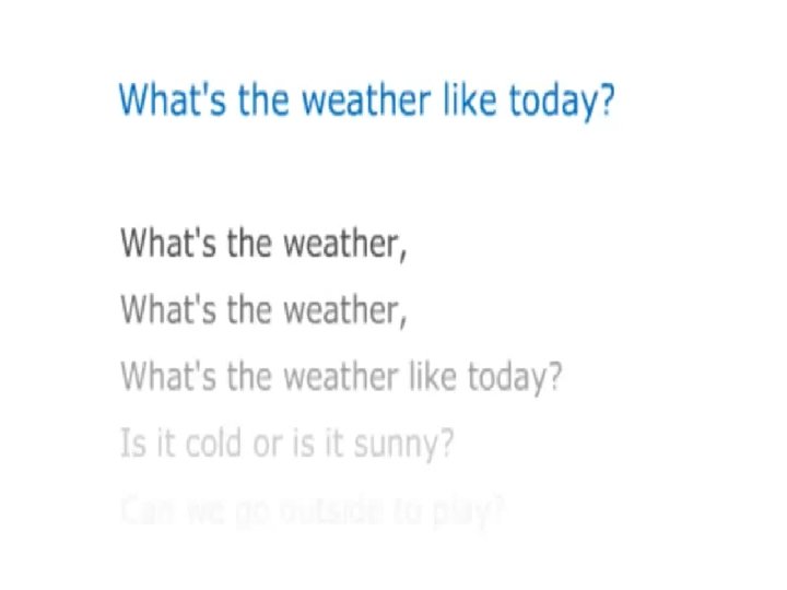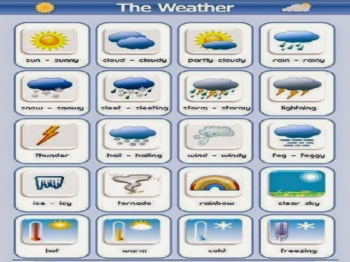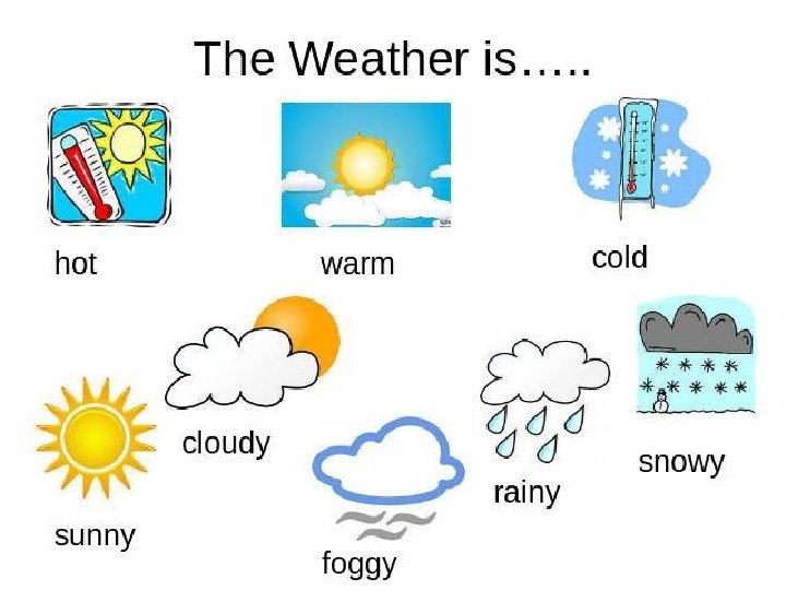What’s the weather like today? • • It is sunny. It is cloudy. It’s snowy. It’s rainy. It’s foggy. It’s warm. It’s hot. It is cold.
