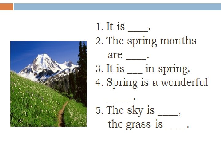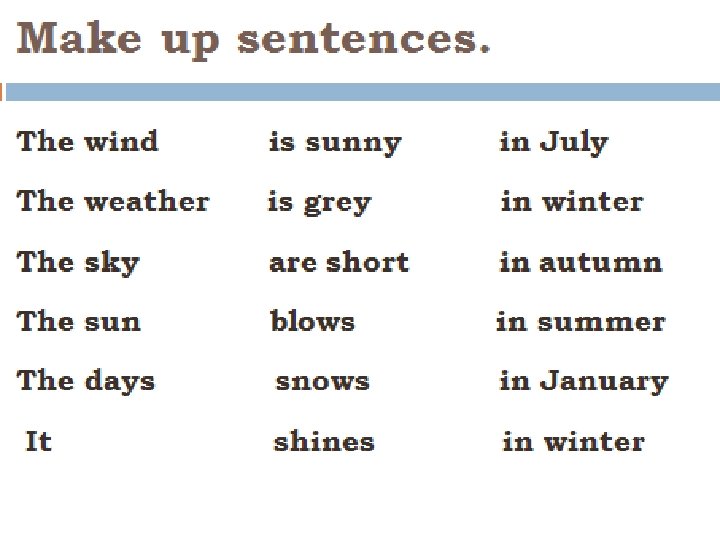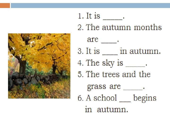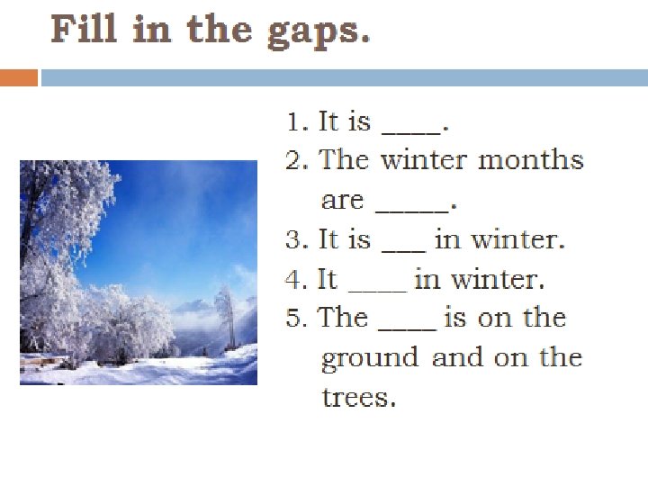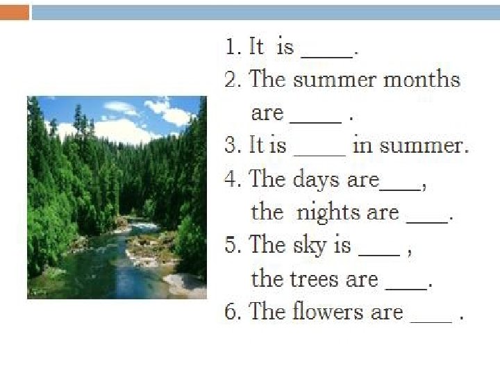 Read the poem, guess the season This is a season When mornings are dark, And birds do not sing In the forests and parks. This is the season When children ski, Play snowballs and dance round the New Year Tree. This is a season when fruit is sweet, This is a season when school friends meet, When noisy and gay, And brown in the sun, With their books and bags To school they run This is a season when leaves fall down Red, orange, yellow, brown. This is a season when nights are short. And children are full of fun and sport. Playing and swimming all day long Will make them healthy and strong. This is a season When snowdrops bloom, When nobody likes To be in the room. This is a season When birds make their nests; This is a season We all like best.
