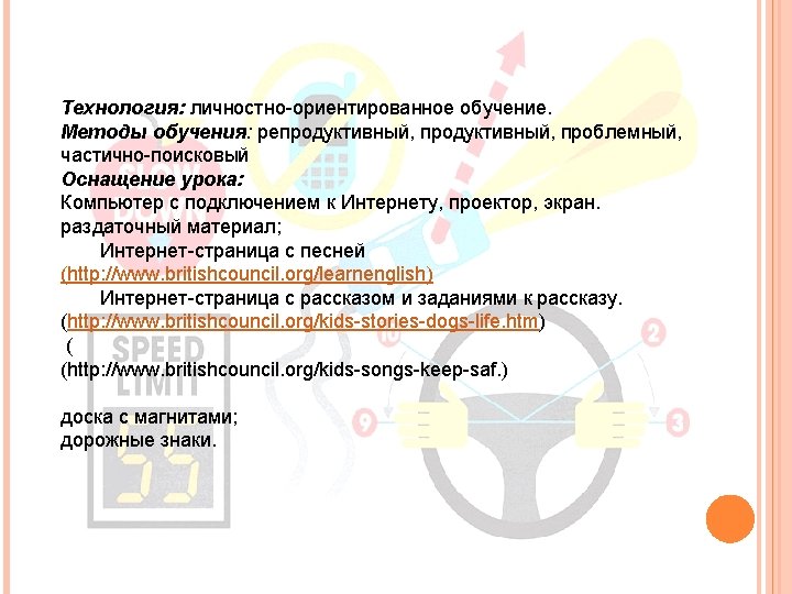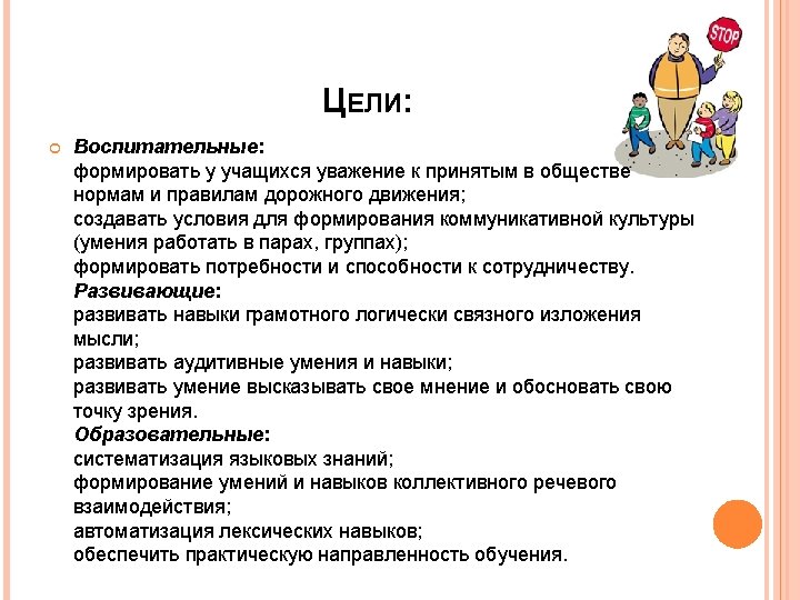 НАЧАЛЬНЫЙ ЭТАП Оргмомент. Учитель приветствует детей: Good morning dear boys and girls. I’m very glad to see you. How are you? Ученики отвечают на приветствие учителя. Фонетическая зарядка. Побуждает учащихся к выполнению задания. Учитель: Look at the board. What are we going to speak about? Ученики: P 1 About Road Safety That’s all right, today we are going to speak about Road Safety, but first of all let’s do our phonetic exercises and remember our poem. Ученики определяют тему и цели урока. (фронтально) Повторяют стихотворение за учителем. (T – Pupils) Мотивация. Целеполагание Учитель: So, we are at school again. Every day you must go to school. But I think that your way to school is very safe. There is little transport in the street and there are no dangerous places for you, that’s why it is not necessary to learn the traffic rules. Prove that we must learn the traffic rules. Ученики составляют короткие предложения о том, почему они должны изучать правила дорожного движения. P 1. No I don’t agree with you. There a lot of cars in the street. P 2. We all live in the town and it is dangerous to cross the road.