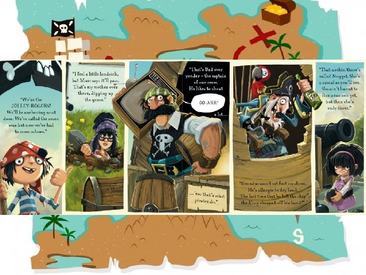 Word Bank - Scary - Brave - Strong - Big - Bold - Can you think of more? - The dad has a big, long an black moustache. - The mum has small, gazing black eyes. - Jim Lad is hyper, loud and strong. - Grandpa has a sharp, pointy and shiny hook. - Nugget is small, mischievous and bold.
