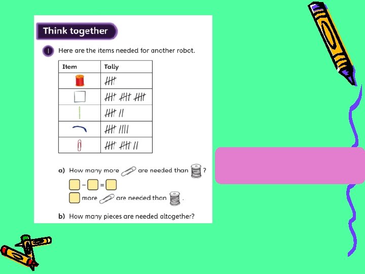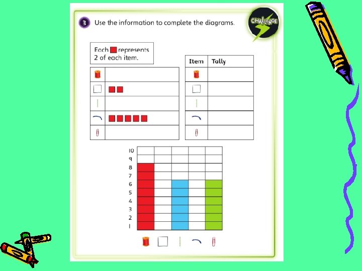 • Look at the tally chart. Is the number of cotton reels correct? Do you need to check the rest of the tally chart? • Look at the pictogram. Do you count the symbol in the first column to find the answer?