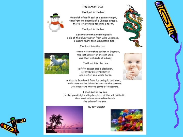 English • Today you are going to write the first part of your Magic Box Poem. • First, remind yourself of what Kit Wright put in his magic box…