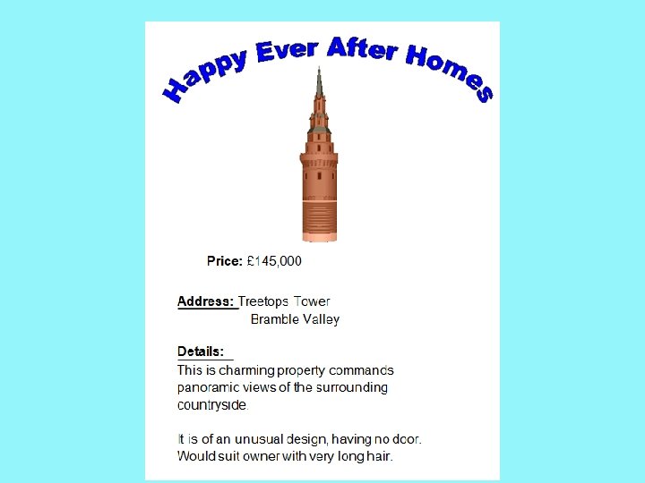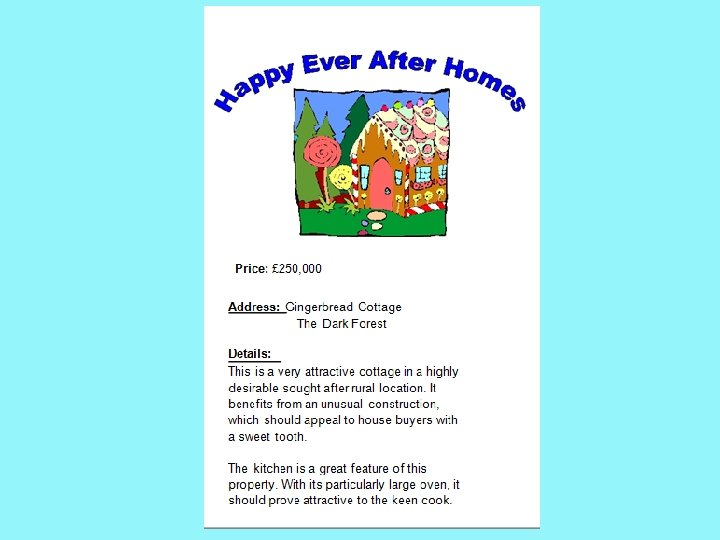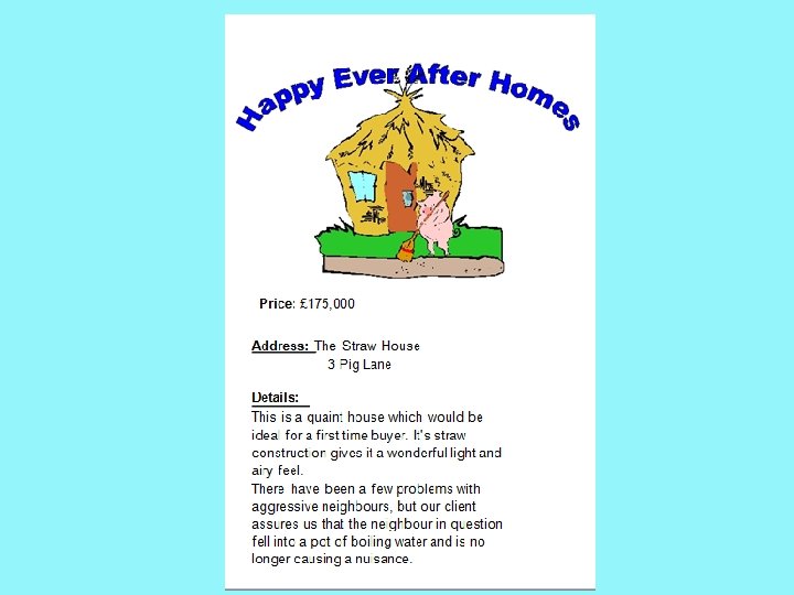 Estate agents sell houses and they are very good at persuading people to buy houses by describing them in a positive way. Have a look at how estate agents may have described story character's houses. Can you guess which house they are describing on the next slides?