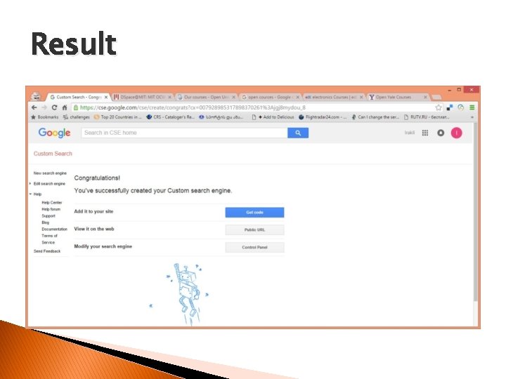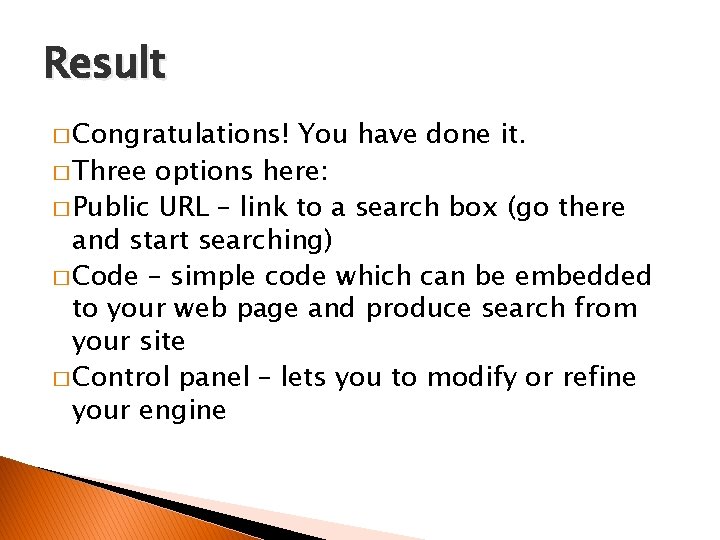 Result � Congratulations! You have done it. � Three options here: � Public URL – link to a search box (go there and start searching) � Code – simple code which can be embedded to your web page and produce search from your site � Control panel – lets you to modify or refine your engine