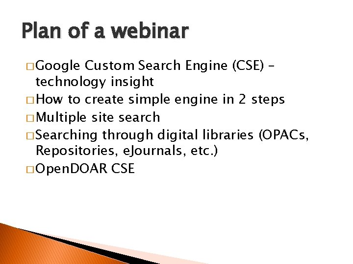 Plan of a webinar � Google Custom Search Engine (CSE) – technology insight � How to create simple engine in 2 steps � Multiple site search � Searching through digital libraries (OPACs, Repositories, e. Journals, etc. ) � Open. DOAR CSE