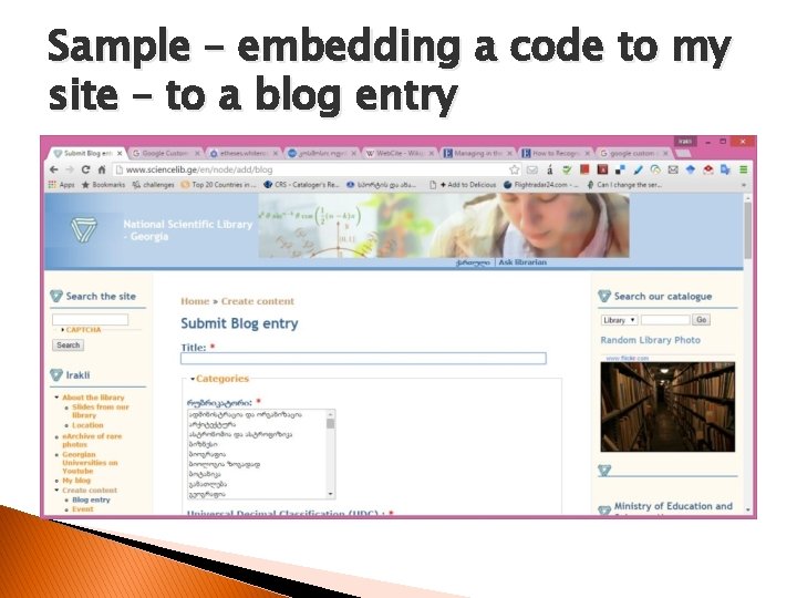 Embedding a code � Just copy the code � Note two versions of a code V 1 & V 2 – you have to chose a one which will work properly on your site � The version depends on your CMS and you can just test both of them.
