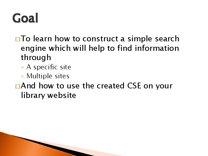 Goal � To learn how to construct a simple search engine which will help to find information through ◦ A specific site ◦ Multiple sites � And how to use the created CSE on your library website