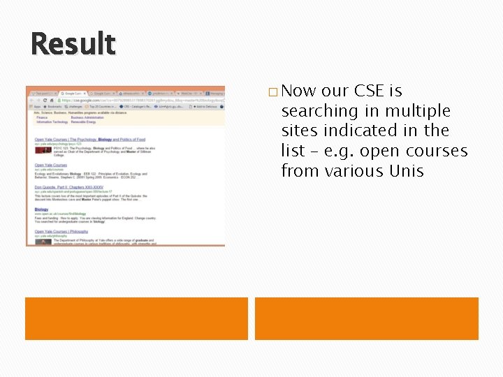 Result � Now our CSE is searching in multiple sites indicated in the list – e. g. open courses from various Unis