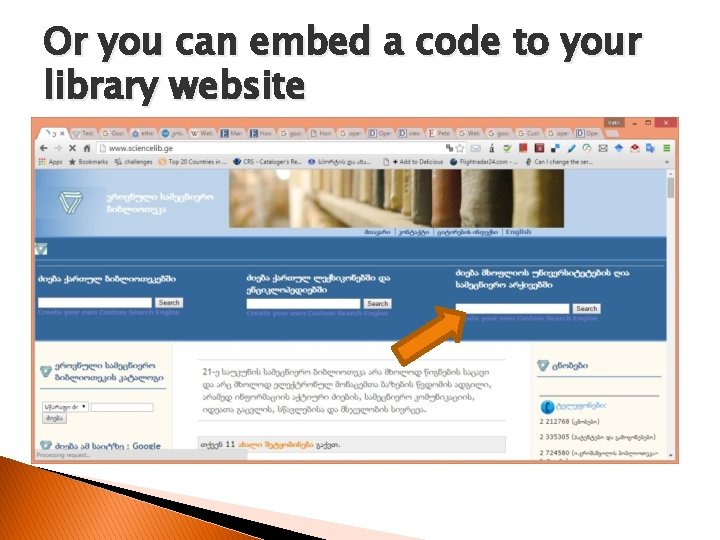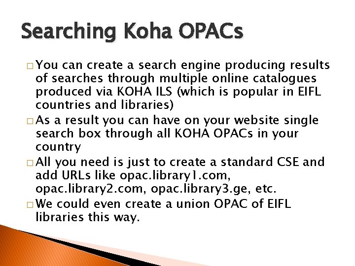 Searching Koha OPACs � You can create a search engine producing results of searches through multiple online catalogues produced via KOHA ILS (which is popular in EIFL countries and libraries) � As a result you can have on your website single search box through all KOHA OPACs in your country � All you need is just to create a standard CSE and add URLs like opac. library 1. com, opac. library 2. com, opac. library 3. ge, etc. � We could even create a union OPAC of EIFL libraries this way.