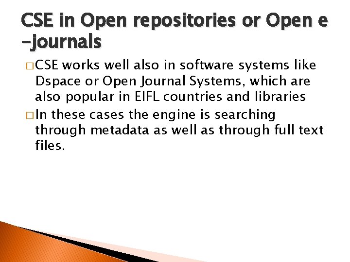 CSE in Open repositories or Open e -journals � CSE works well also in software systems like Dspace or Open Journal Systems, which are also popular in EIFL countries and libraries � In these cases the engine is searching through metadata as well as through full text files.