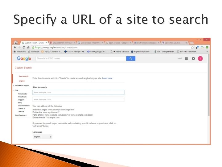 Starting a CSE � Go directly to a https: //cse. google. com/cse/ � OR search for “Google Custom Search” � Login freely using your Google account