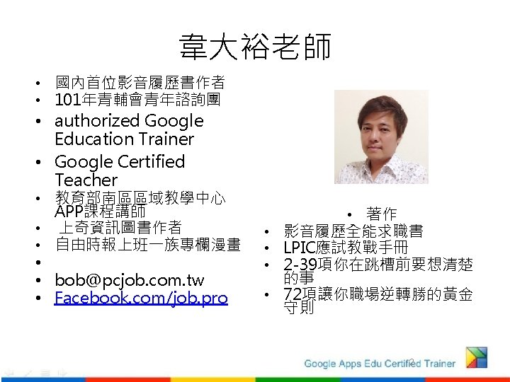 Google for Education authorized Google Education Trainer Google Slides: 48 Download presentation Google for Education 認證暨培訓計畫 韋大裕 authorized Google Education Trainer Google Certified Teacher bob@pcjob. com. tw http: //www. pcjob. com. tw 1 3 4 5 7 8 • • https: //sites. google. com/site/shuruhg/ https: //sites. google. com/a/stu. edu. tw/evaair/ http: //www. pcjob. com. tw https: //sites. google. com/site/ksuinformationteam 102097/home 9 雲端平台認證 Google Apps Education Sites Individual Qualification (IQ) 教育部技專資料庫證照代碼 8824 雲端文件認證 Google Apps Education Drive Individual Qualification (IQ) 教育部技專資料庫證照代碼 8821 Gmail認證 Google Apps Education Gmail Individual Qualification (IQ) 教育部技專資料庫證照代碼 8820 行程管理認證 Google Apps Education Calendar Individual Qualification (IQ) 教育部技專資料庫證照代碼 8822 管理人員認證 Google Apps Education admin Individual Qualification (IQ) 教育部技專資料庫證照代碼 8823 APP應用認證 Google Apps Education Tablet with Play Individual Qualification (IQ) Google 系統認證 Google Apps Education Chromebooks Individual Qualification (IQ) 瀏覽器應用認證 Google Apps Education Chrome Individual Qualification (IQ) 10 16 27 34 台灣第一認證授權教學單位 https: //www. google. com/enterprise/marketplace/view. Listing? product. Listing. Id=24506+ 7066843088069170122&category=EDU+Specialists&query&pli=1 41 校園辦課經驗達 300場次以上 可參考近期活動 http: //www. pcjob. com. tw/project-updates 45 Google for Education 認證暨培訓計畫 46