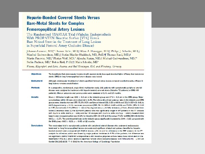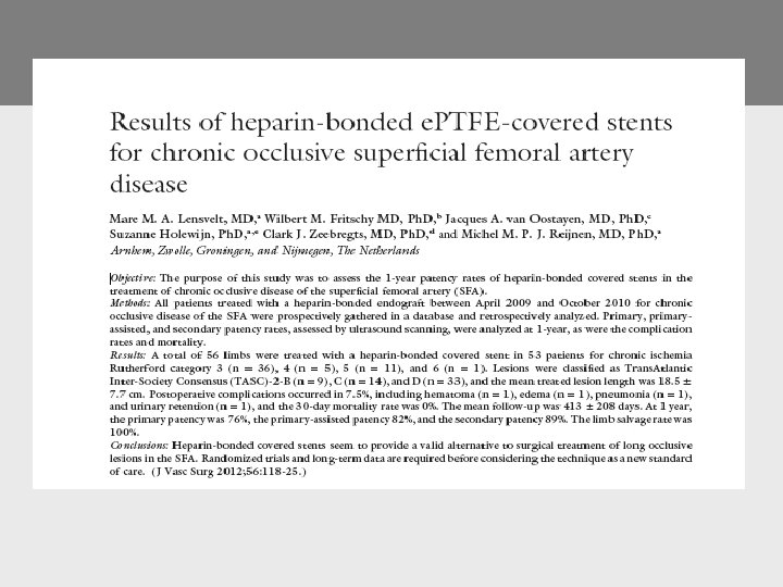 GORE® VIABAHN® with PROPATEN Bioactive Surface: First Data • • 50 membros 85 Viabahn No evidence of HIT 0% trombose em 6 meses Chadda N, Museitif R, Djelmami-Hani M, et al. Heparin-Bonded VIABAHN Stent Graft for SFA Lesions: incidence of stent thrombosis and heparin-induced thrombocytopenia. Abstract presented at the TCT 2008: Transcatheter Cardiovascular Therapeutics 20 th Annual Scientific Symposium; October 12 -17, 2008; Washington, DC. American Journal of Cardiology 2008; 102(8)Supplement 1: 221 i. GORE®, PROPATEN, VIABAHN ®, and designs are trademarks of W. L. Gore & Associates. © 2009, 2010 W. L. Gore & Associates, Inc.