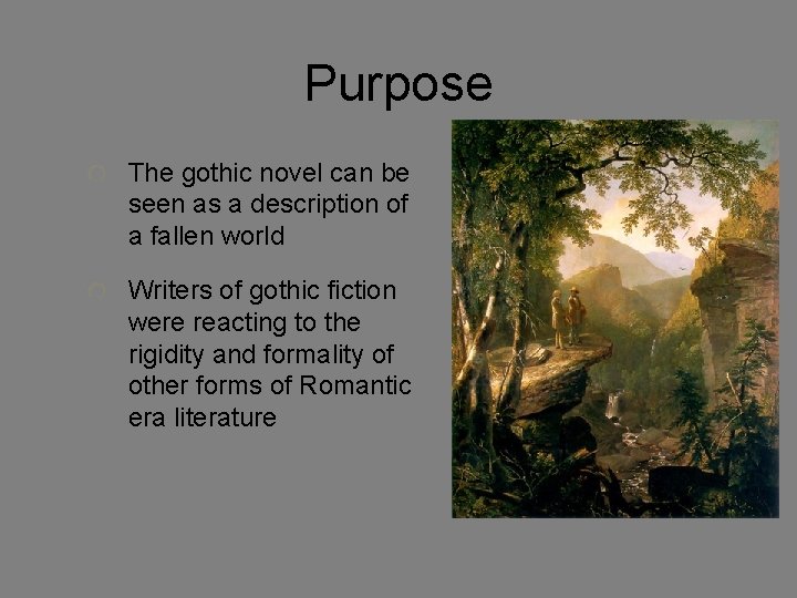 Purpose The gothic novel can be seen as a description of a fallen world Writers of gothic fiction were reacting to the rigidity and formality of other forms of Romantic era literature