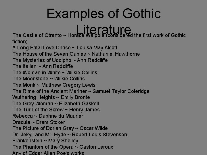 Examples of Gothic Literature The Castle of Otranto ~ Horace Walpole (considered the first work of Gothic fiction) A Long Fatal Love Chase ~ Louisa May Alcott The House of the Seven Gables ~ Nathaniel Hawthorne The Mysteries of Udolpho ~ Ann Radcliffe The Italian ~ Ann Radcliffe The Woman in White ~ Wilkie Collins The Moonstone ~ Wilkie Collins The Monk ~ Matthew Gregory Lewis The Rime of the Ancient Mariner ~ Samuel Taylor Coleridge Wuthering Heights ~ Emily Bronte The Grey Woman ~ Elizabeth Gaskell The Turn of the Screw ~ Henry James Rebecca ~ Daphne du Maurier Dracula ~ Bram Stoker The Picture of Dorian Gray ~ Oscar Wilde Dr. Jekyll and Mr. Hyde ~ Robert Louis Stevenson Frankenstein ~ Mary Shelley The Phantom of the Opera ~ Gaston Leroux Any of Edgar Allen Poe's works