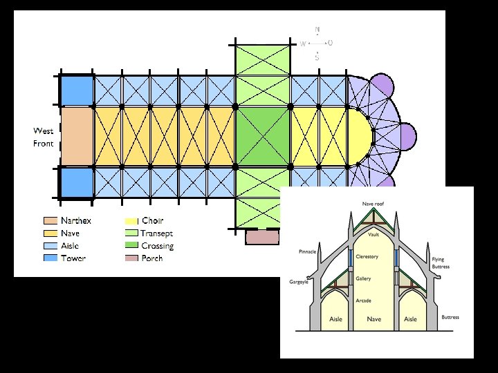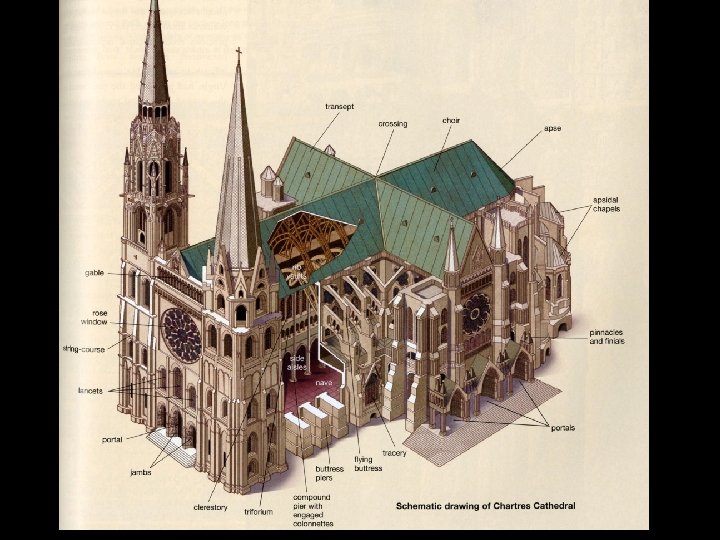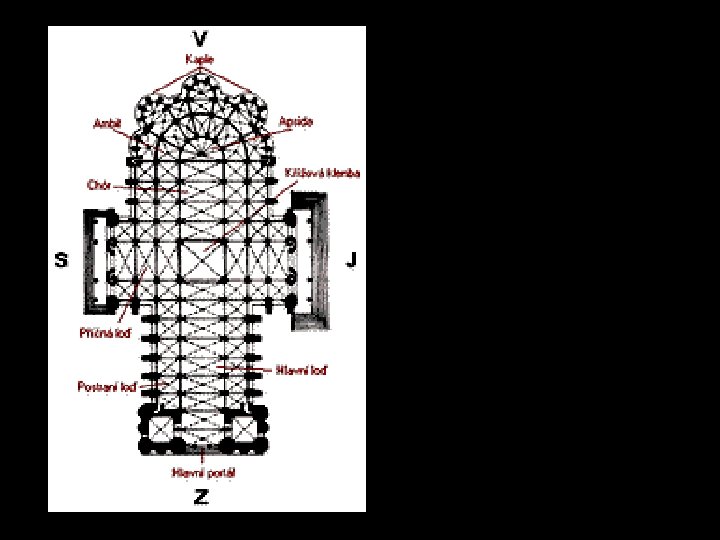 Nové prvky gotické architektury • Křížová klenba • Lomený oblouk • Slabá zeď, zpevněná systémem vnějších opěrných pilířů a oblouků (= opěrný systém) • Fiály (věžičky), arkády (oblouky oddělené sloupy), arkýře, chrliče • Princip vertikály (všechno směřuje nahoru) • Vysoká okna s vitrážemi (– lomený oblouk) • Rozety (kruhová okna), kružba (zdobení na špičce okna)
