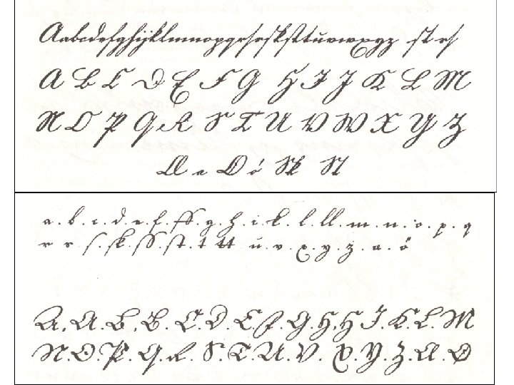 • • • Mere elegant udtryk i stedet for grov og snørklet Mange bogstaver identisk med skråskriftens Skrev med tilspidset fjerpen Mere udbredt at ”kløve” a, g, r, v, i og j Knæk i bunden af b og l e ændrer form: fra skråskrift-r til klemt n h går fra blødt til mere skarpt Stregen i t går fra tværstreg til sløjfe c og i næsten identiske (beg. at skrive streg over c) v bliver mindre, kan igen forveksles med r Højt s skrives omvendt af h og f