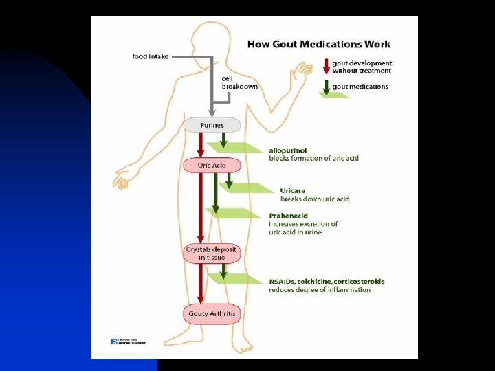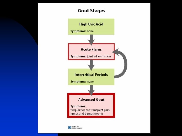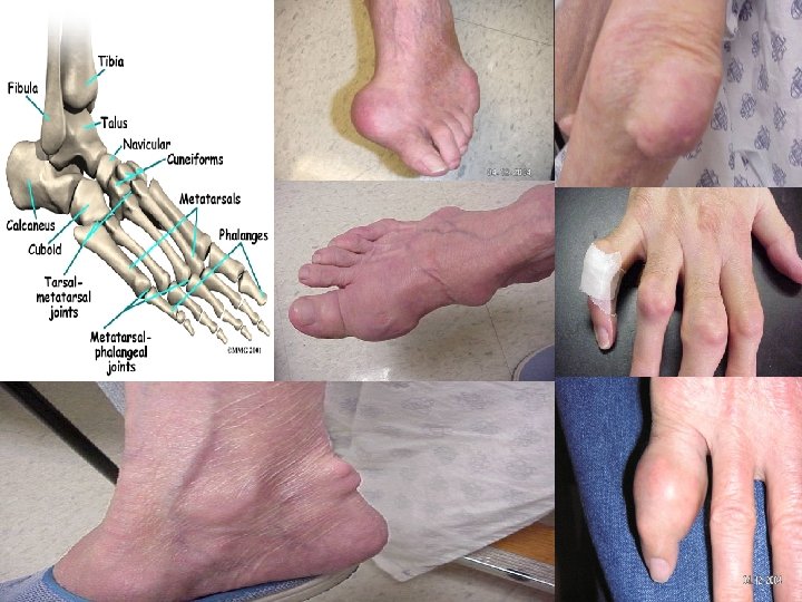Complications of gout. Disability Tophi Arthritis erosif dan deformitas Renal disease n Uric acid calculi (10– 15%) n Chronic urate nephropathy n n Acute uric acid nephropathy (usually secondary to chemotherapy) Avascular necrosis of the femoral head