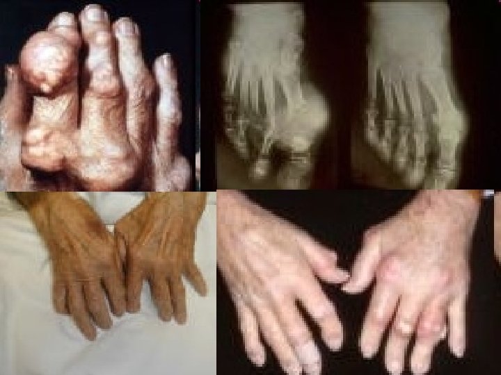Gout Tophaceous Kronik (1) n n Jika untreatment dpt berkembang menjadi penyakit polyarticular kronik dan terbentuk tophi Tophi terjadi pada kartilago, membran sinovial, dan jaringan lunak Jika tophi ulserasi akan tampak isinya berupa kapur yang berwarna putih yang merupakan kristal asam urat Manifestasi lain: u Disfungsi renal (90%) u Albuminuria (permulaan) u Batu ginjal (10 -15%) u Peningkatan kadar trigliserida u Hipertensi