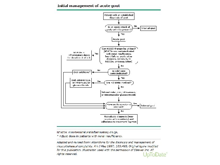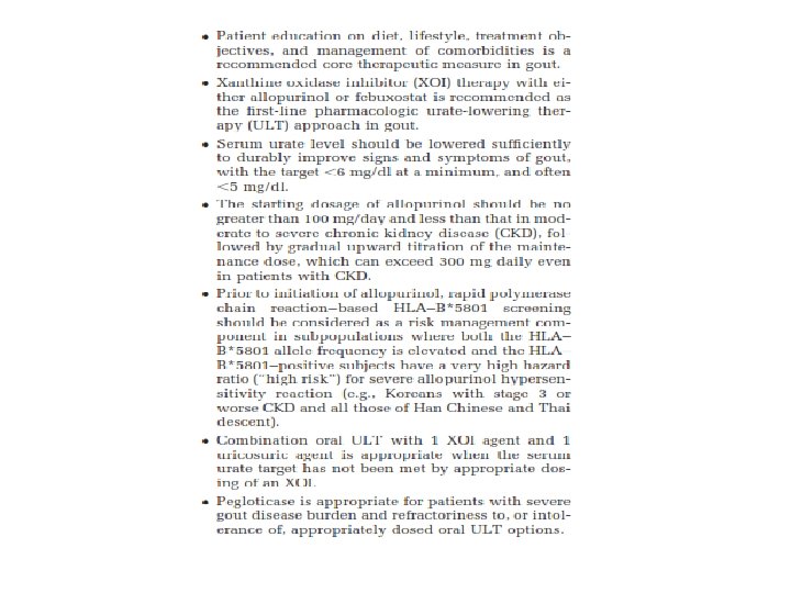 Renal Complications • Nephrolithiasis – Risk factors: increase uric acid excretion, reduced urine volume, and low urine p. H • Chronic urate nephropathy – Urate crystals can deposit in renal medullary interstitium producing inflammatory changes and fibrosis – Clinical features are non specific: renal function impairment, bland urinary sediment, mild proteinuria and serum urate concentrations often higher than expected for the degree of renal impairment. – Biopsy confirms diagnosis