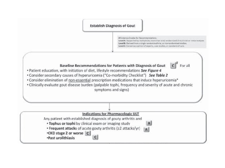 Diagnosis • 5 clinical classification criteria for gout currently exist: Rome, New York, ACR, Mexico and Netherlands • These classification criteria have not been extensively validated • Diagnosis should be based on combination of clinical, historical and laboratory data if arthrocentesis cannot be performed. Diagnosis is considered provisional.