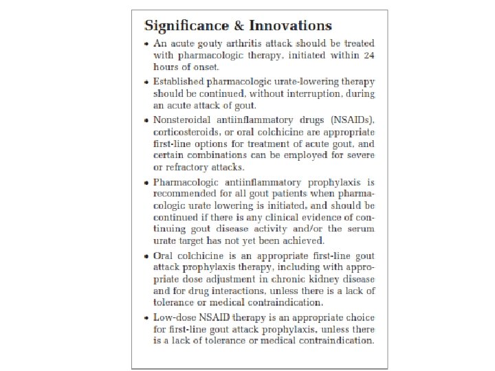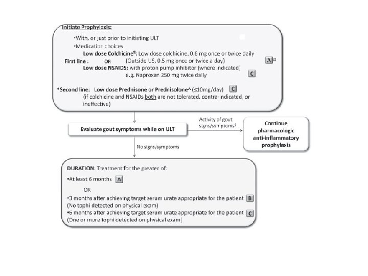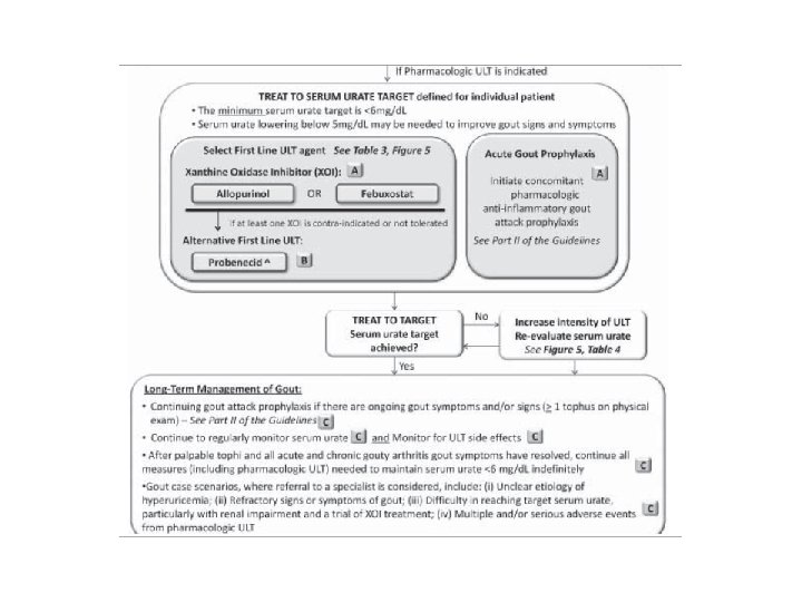 Treatment • When initiating urate lowering therapy, can precipitate acute gouty arthritis. Therefore, prophylaxis often given