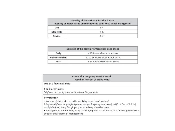 Stages of Gout • • Asymptomatic tissue deposition Acute Gouty Arthritis Intercritical Gout Chronic Articular and Tophaceous Gout
