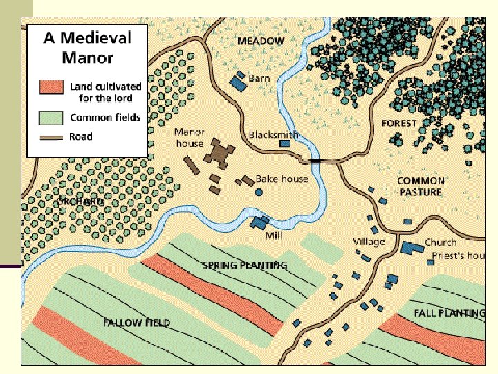 Life on a Manor n Due to invasions, each manor was largely self-sufficient, growing or producing all of the basic items needed for food, clothing, and shelter. n To meet these needs, the manor had buildings devoted to special purposes, such as the mill for grinding grain, the bake house for making bread, and the blacksmith shop for fashioning metal goods. n Notice that one of the fields has been left fallow, or unplanted, so that the soil can replenish its nutrients