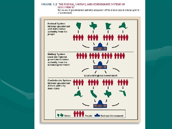 Governing Systems • Unitary- national government rules • China, United Kingdom • Confederation- State government rules • The Commonwealth of Independent States (CIS) - formerly known as the Soviet Union; U. S. under the Articles • Federal State- State and national governments share power