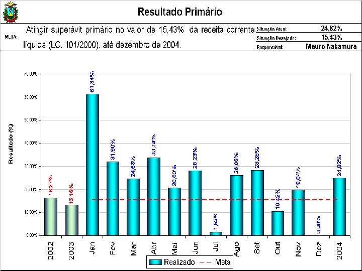 AVALIAÇÃO DE RESULTADOS DAS METAS 2004 SAF META 1. 1 Atingir superávit primário no valor de 15, 43% da receita corrente líquida (LC 101/2000), até dezembro de 2004 RESULTADOS Janeiro a Novembro/2004 Resultado primário realizado R$ 866, 2 milhões Receita Corrente Líquida R$ 3. 489, 7 milhões META ATINGIDA = 24, 82 % GESTÃO A VISTA Ver Gráfico