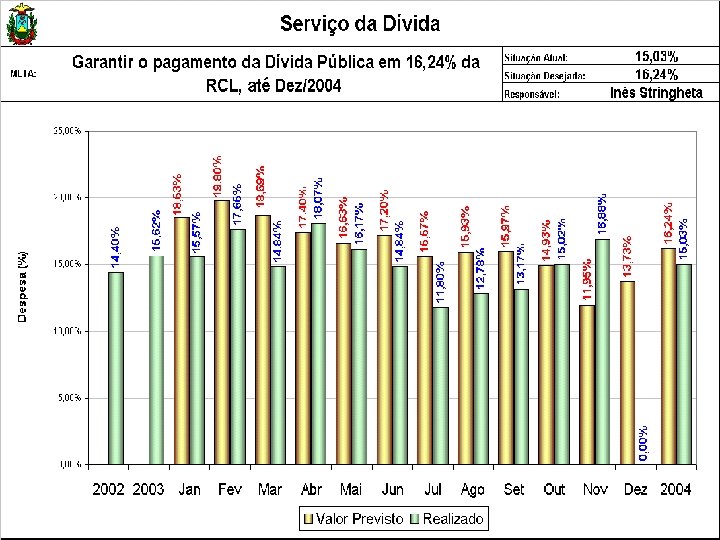 AVALIAÇÃO DE RESULTADOS DAS METAS 2004 SAF META 1. 2 Garantir o pagamento da Dívida Pública em 16, 24% da RCL, até dez/2004 RESULTADOS Janeiro a Novembro/2004 Dívida pública realizada R$ 524, 6 milhões Receita Corrente Líquida R$ 3. 489, 7 milhões META ATINGIDA = 15, 03 % GESTÃO A VISTA Ver Gráfico