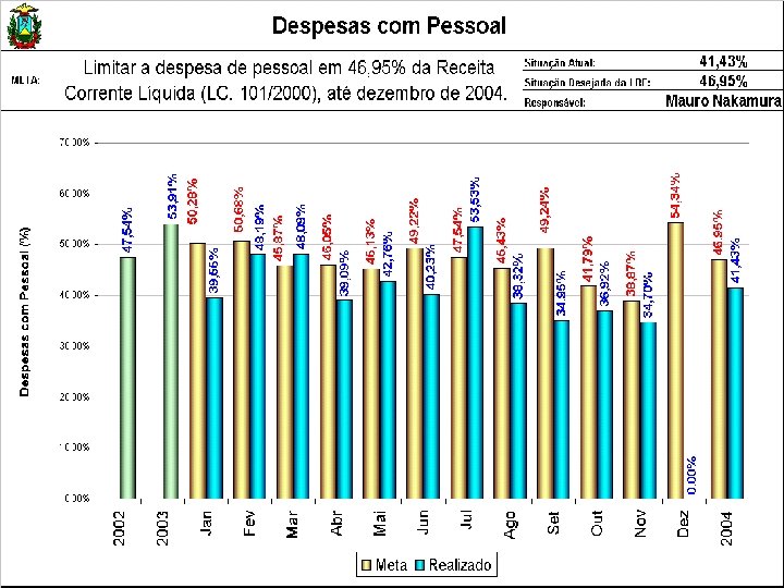 AVALIAÇÃO DE RESULTADOS DAS METAS 2004 SAF META 1. 3 Limitar a despesa de pessoal em 46, 95% da Receita Corrente Líquida (LC 101/2000), até dezembro de 2004 RESULTADOS Janeiro a Novembro/2004 Despesa de Pessoal Realizada R$ 1. 445, 7 milhões Receita Corrente Líquida R$ 3. 489, 7 milhões META ATINGIDA = 41, 43 % GESTÃO A VISTA Ver Gráfico