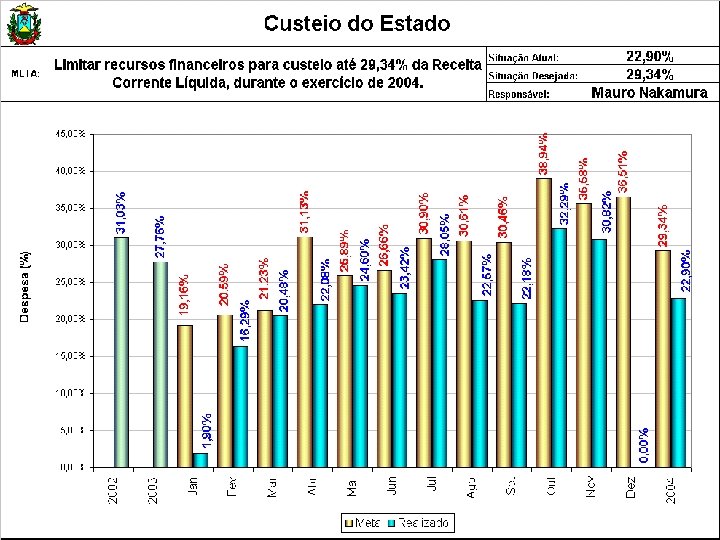 AVALIAÇÃO DE RESULTADOS DAS METAS 2004 SAF META 1. 4 Limitar recursos financeiros para custeio até 29, 34% da Receita Corrente Líquida, durante o exercício de 2004 RESULTADOS Janeiro a Novembro/2004 Outros custeios realizados R$ 799, 2 milhões Receita Corrente Líquida R$ 3. 489, 7 milhões META ATINGIDA = 22, 90 % GESTÃO A VISTA Ver Gráfico
