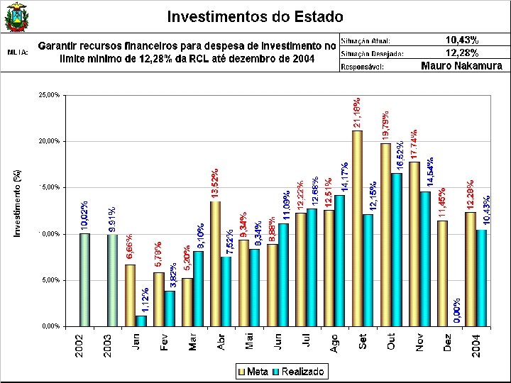 AVALIAÇÃO DE RESULTADOS DAS METAS 2004 SAF META 1. 5 Garantir recursos financeiros para despesa de investimento no limite mínimo de 12, 28% da RCL, até dezembro de 2004 RESULTADOS Janeiro a Novembro/2004 Investimento realizado R$ 363, 9 milhões Receita Corrente Líquida R$ 3. 489, 7 milhões Realizado = 10, 43 % GESTÃO A VISTA Ver Gráfico