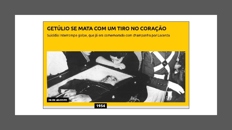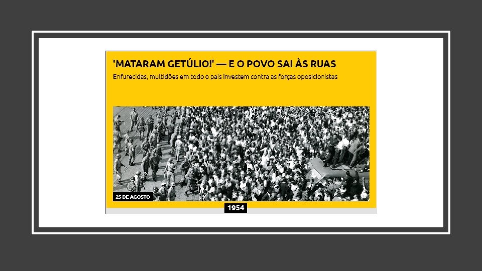 ATENTADO NA RUA TONELEIROS • Atentado contra Carlos Lacerda • Envolvimento de Gregório Fortunato (chefe de segurança de Getúlio) • Morte do Major da Aeronáutica • Lacerda leva tiro no pé • Investigação da Aeronáutica • Ligação do atentado à Getúlio Vargas