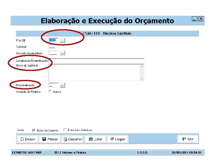 DESCRIÇÃO SUBTÍTULO NOME DA AÇÃO - LOCALIZAÇÃO OU ESPECIFICAÇÃO NOME DA REGIONALIZAÇÃO Nome da Ação será automaticamente preenchido pelo sistema no nome do subtítulo. Localização ou Especificação é de caráter facultativo. Na hipótese de ação não ser passível de deslocamento, não há necessidade de identificação da “localização ou Especificação”, visto que o nome do projeto, da atividade ou da operação especial já atua como localizador ou especificador do subtítulo. Nome da Regionalização será automaticamente preenchido pelo sistema no nome do subtítulo, quando de sua definição.