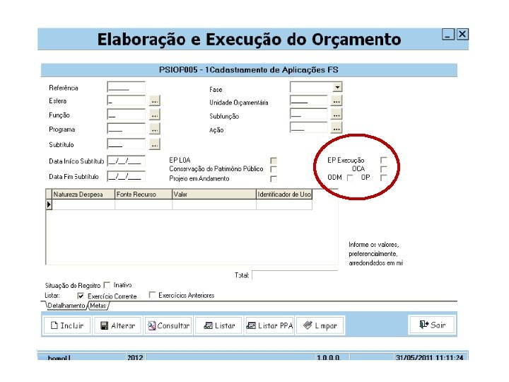 8) ELEMENTO 51 Em atividade ou operação especial não poderá conter programação para o ELEMENTO DE DESPESA 51. (Art. 25, III, da PLDO 2013); 9) SUBTÍTULOS IDÊNTICOS Na programação de despesas, são vedadas: “Programação que possua a classificação funcional e estrutura programática com natureza da despesa e descritor de “SUBTÍTULOS IDÊNTICOS”, no âmbito da mesma UO. Art. 25, PLDO 2013